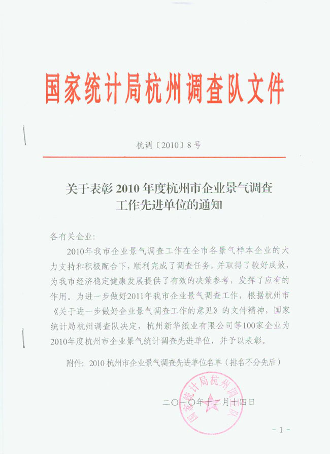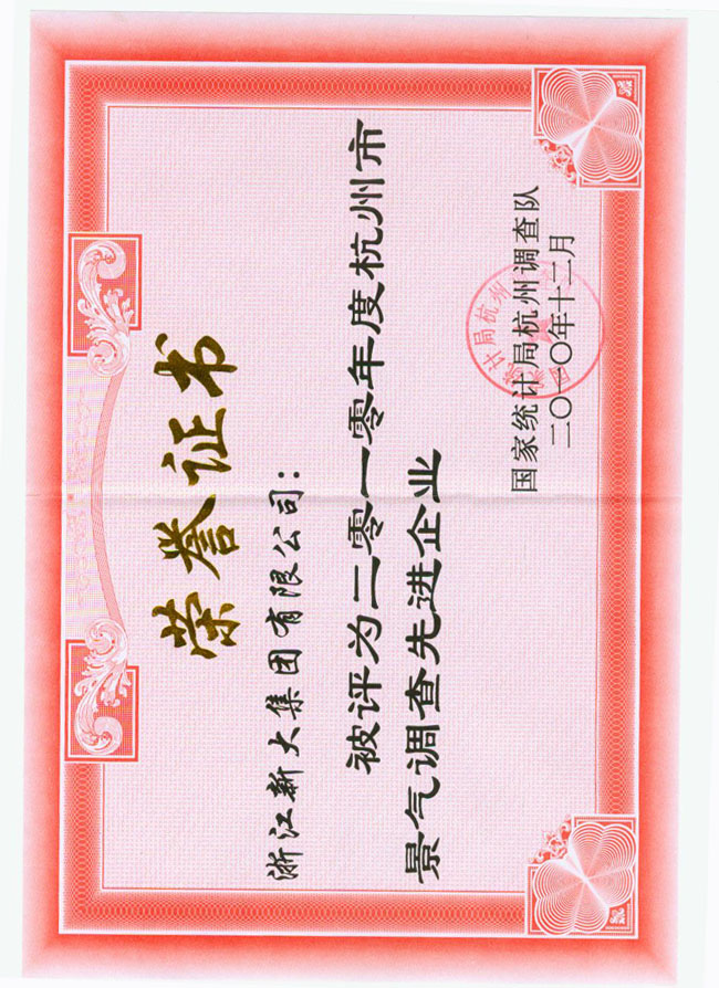 新大集团被评为2010年度杭州市企业景气调查工作先进单位