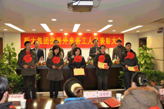 1月21日下午,新大集团优秀外来务工人员表彰大会在五楼会议室隆重召开。大会由新大党委副书记、总经理张汝和主持,党委书记、董事长姜益民作重要讲话,省供销社副主任周加洪、省财贸工会主席沈一凡、省供销社直属机关党委副书记毛国定莅临会议并致辞,优秀外来务工人员代表肖慧和沈卫红讲述了各自的从业经历和发自内心的感激之情。集团经营班子成员、各职能部门正副负责人、工会委员、团委代表、相关单位代表和受表彰的优秀外来务工人员出席了本次大会。